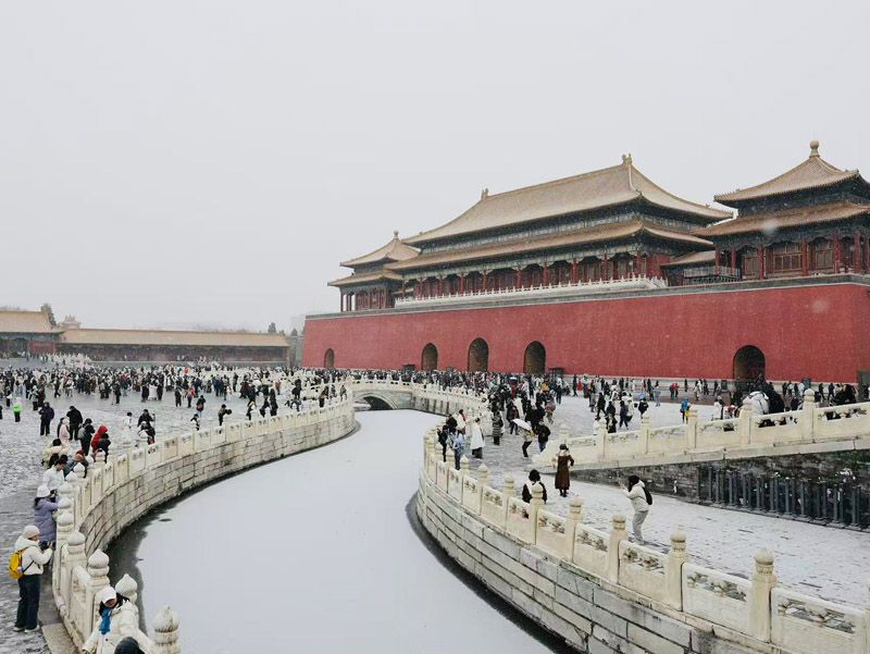 12月12日,北京迎来今冬首场降雪,故宫门前,游客排长队等候入场。