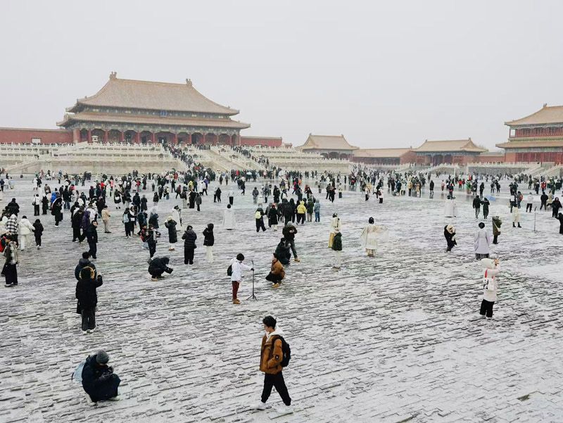 12月12日,故宫解锁限定雪景,红墙白雪间游人络绎不绝。