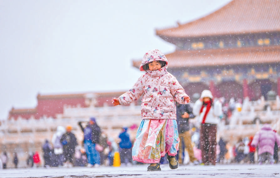 故宫雪花纷飞,小朋友在雪中无忧奔跑。本报记者 武亦彬摄