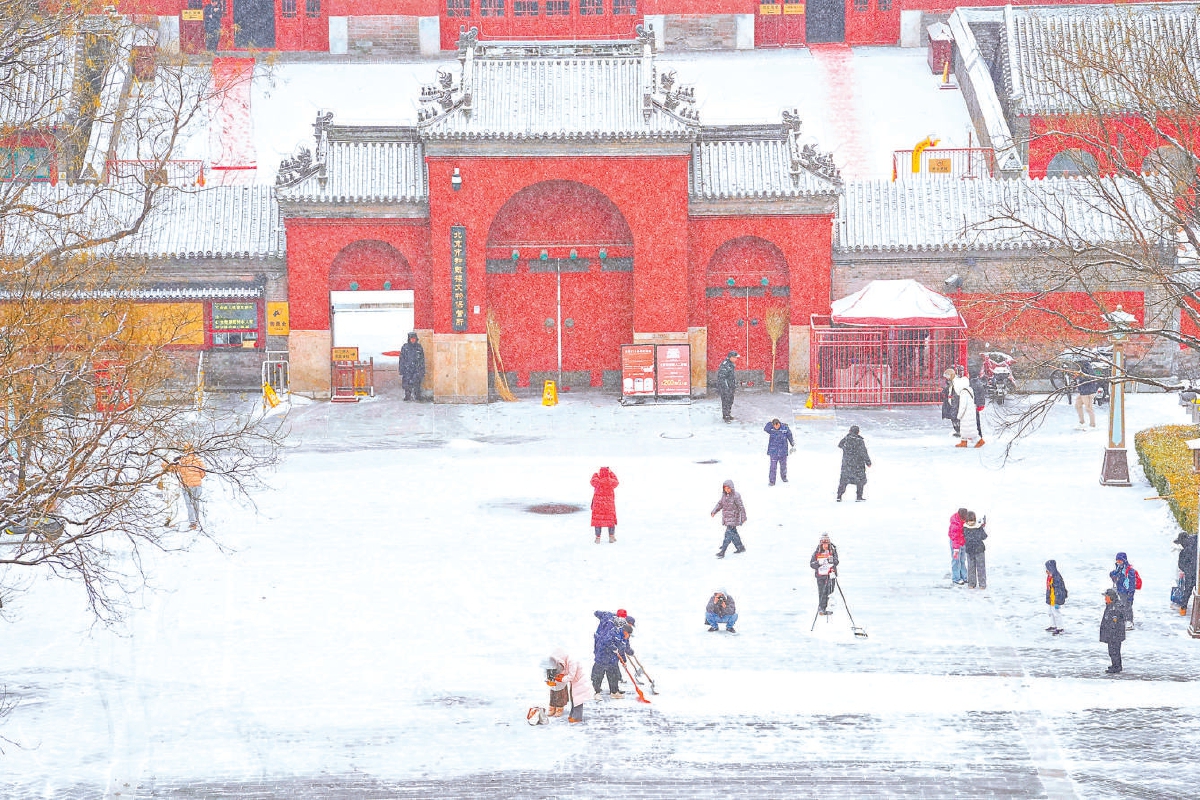 阜成门内大街北侧,700余岁的妙应寺白塔银装素裹。红墙映白雪,塔上风铃作响,观众漫步在古建之间,找准角度按下快门。白塔寺院内,10名工作人员拿着笤帚,每隔一段时间扫一次雪,为观众开辟出一条参观路线。“下雪后,不少观众来拍红墙白塔,别有一番韵味。为此,我们专门留出了‘观景位’,只清扫博物馆主要参观路线和一些古砖、石阶上的积雪,让观众都能拍到满意的雪景照。”白塔寺管理处副主任顾莹说,古建和观众的安全是博物馆首要考虑的,“为了避免对古建造成伤害,我们采用最原始的方法扫雪除冰,不能撒盐或用其他化学方式。”