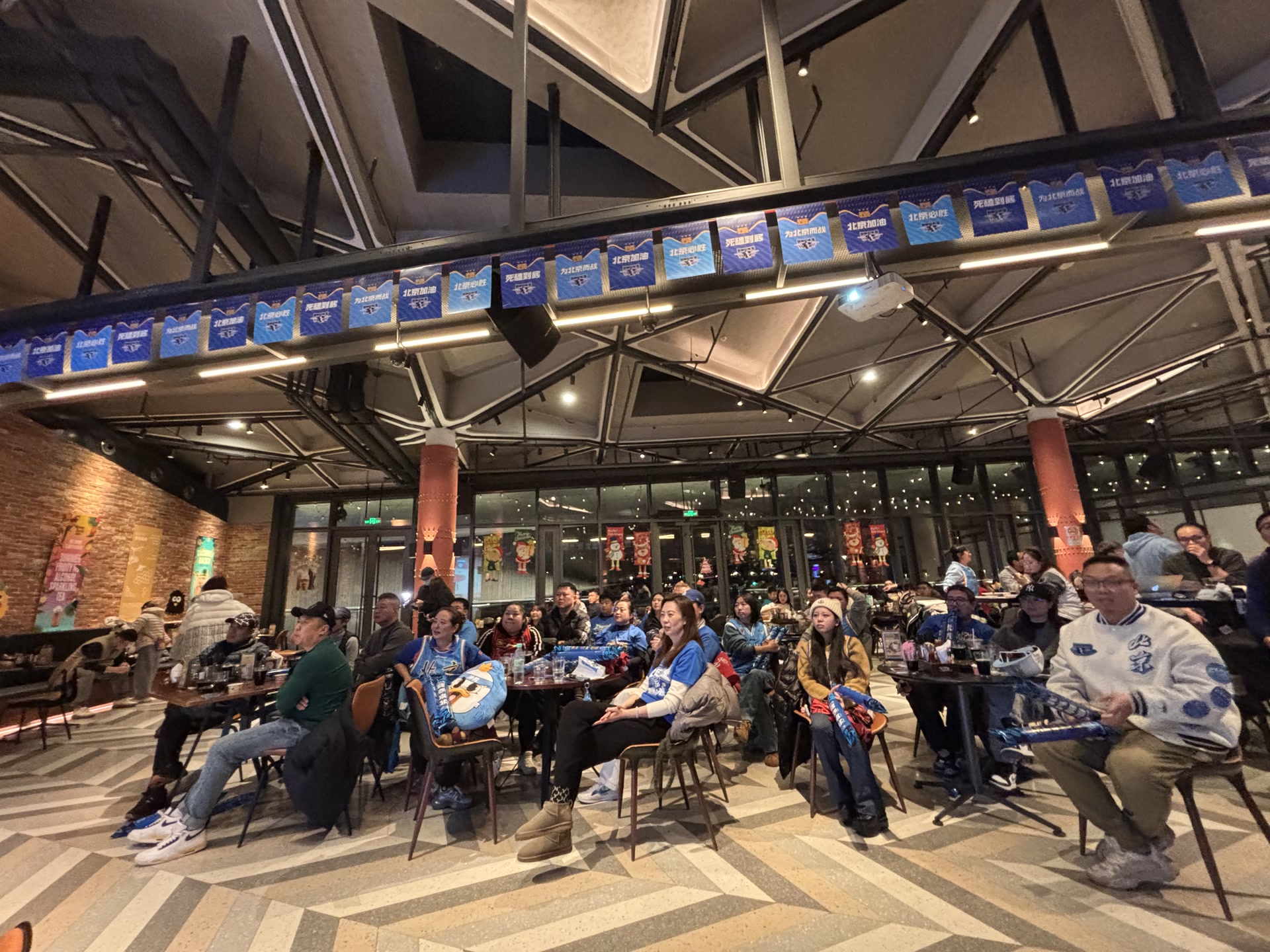 傍晚时分,第二现场香啤坊餐厅已经成为球迷们欢乐的海洋,现场随处可见印着“北京必胜”字样的应援物,球迷们身着北京队球衣,有说有笑地等待着比赛开始。球迷楠楠一家人下午就来到了首钢园,逛了六工汇商场后又来到香啤坊饱餐一顿。儿子也是球迷,兴奋地和霹雳鸭吉祥物人偶合影。