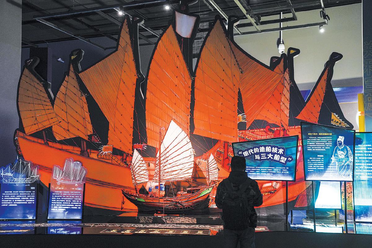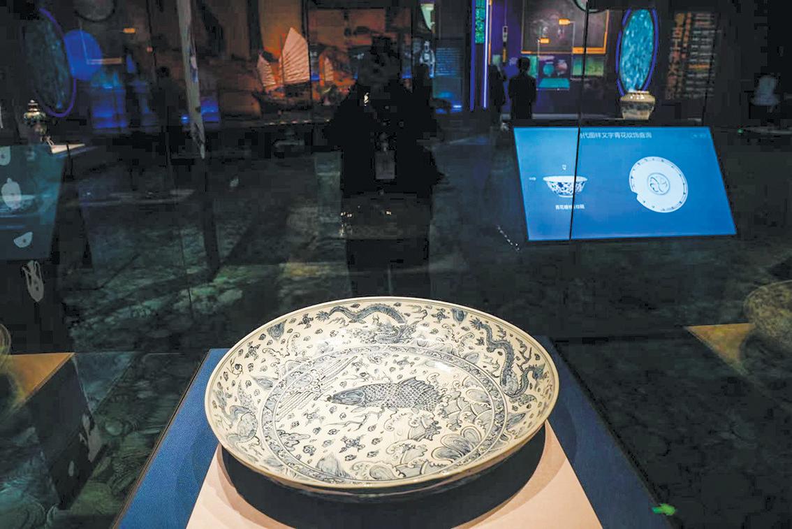 12月16日,北京大运河博物馆,媒体在参观明代的造船技术与三大船型(下图)。当日,“向海而行——中国南海西北陆坡海域深海考古特展”在北京大运河博物馆开幕,377组件文物配合水下影像、考古故事,带领观众一探1500米下的深海。上图为展出的青花鱼跃龙门应龙纹大盘。 新京报记者 浦峰 摄
