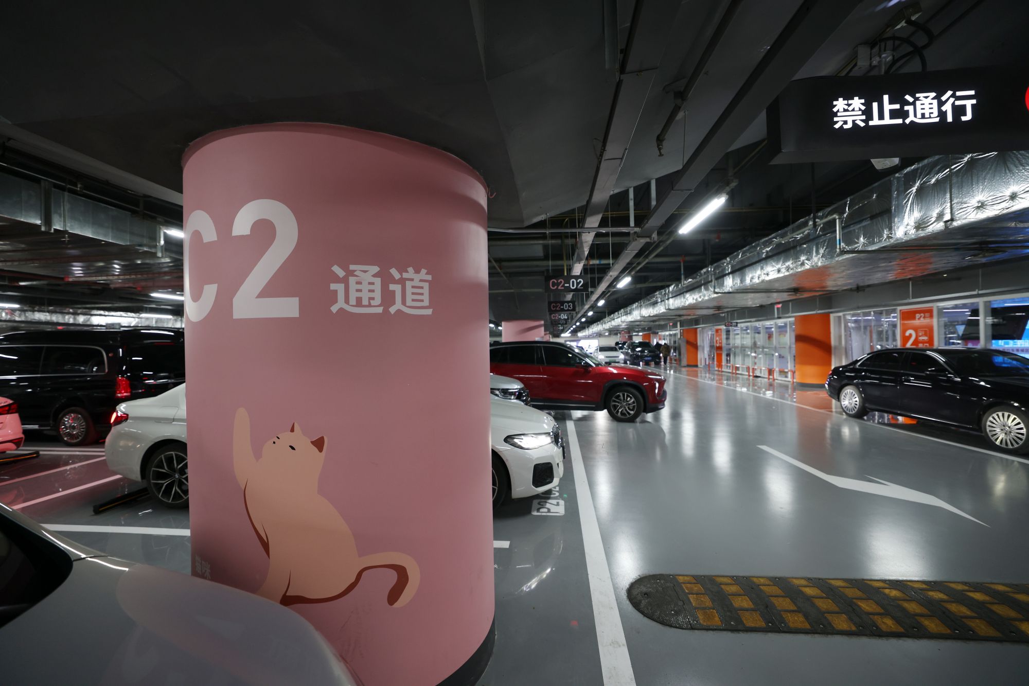 北京南站西地下P2停车场采用“字母+主题动物”的创意分区设计,如C区对应粉色的小猫(Cat)。新京报记者 王贵彬 摄