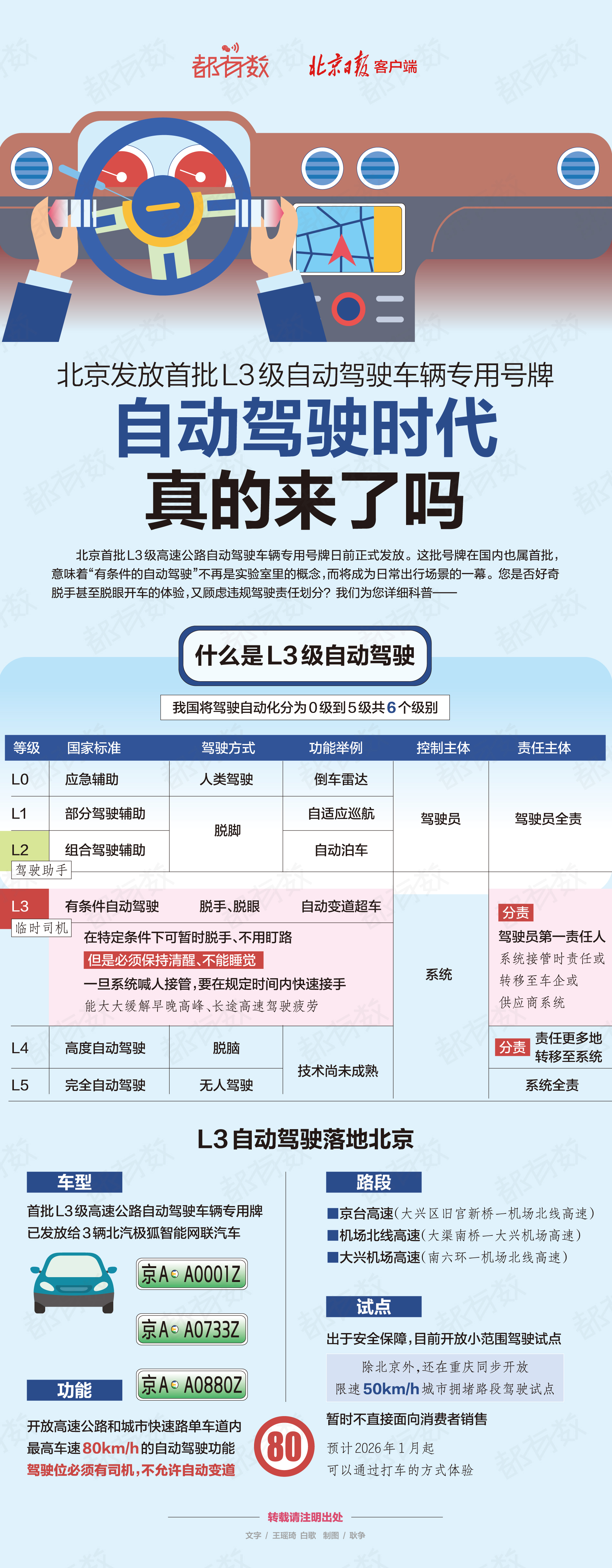 北京首批L3级高速公路自动驾驶车辆专用号牌日前正式发放。这批号牌在国内也属首批,意味着“有条件的自动驾驶”不再是实验室里的概念,而将成为日常出行场景的一幕。您是否好奇脱手甚至脱眼开车的体验,又顾虑违规驾驶责任划分?我们为您详细科普——