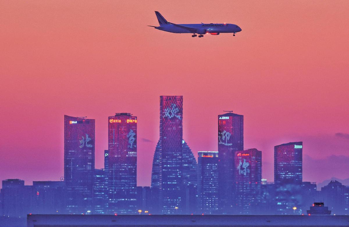 场景:一架航班在城市上空飞行。