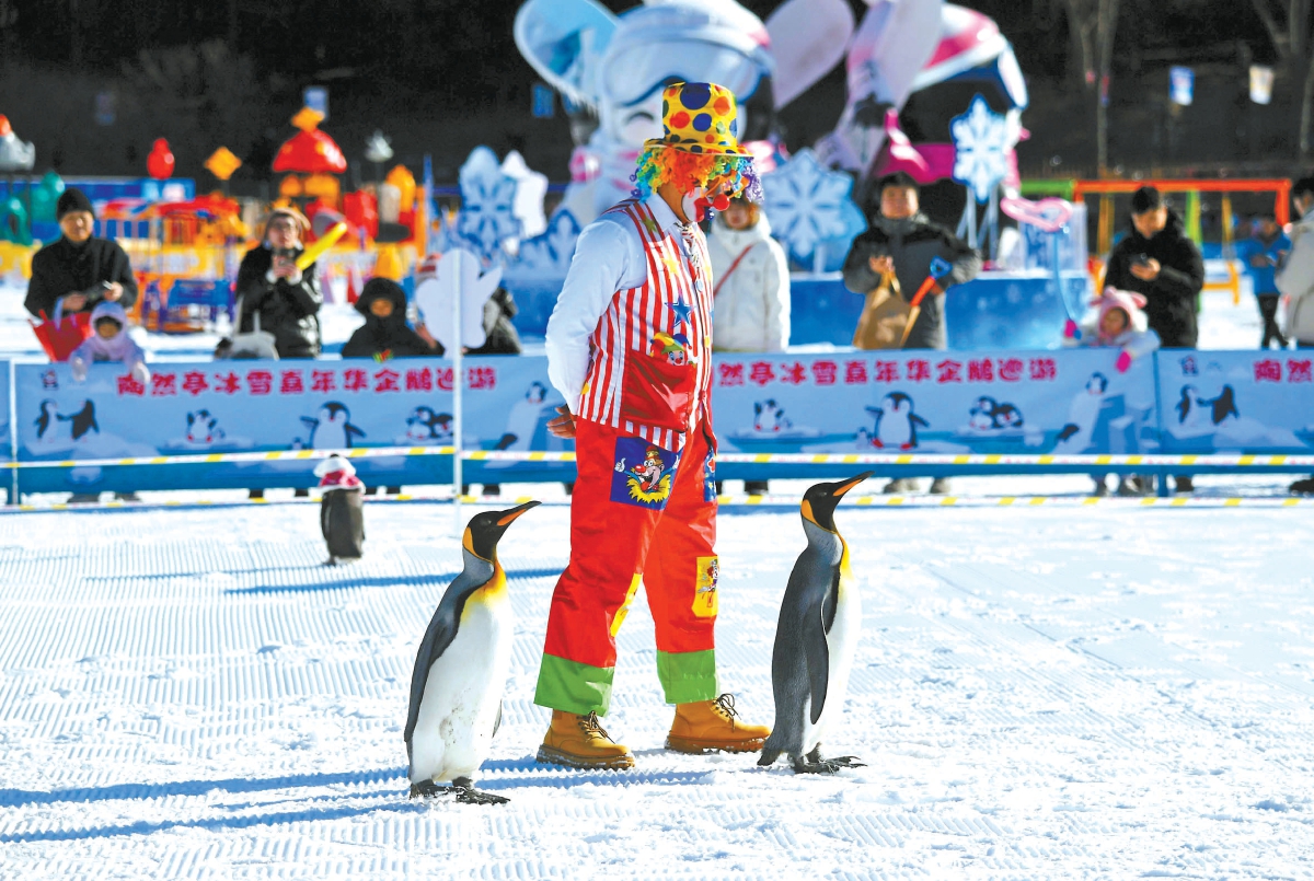 昨日,记者提前探访陶然亭公园雪场。只见王企鹅、帽带企鹅、巴布亚企鹅拍打着小翅膀走来,憨态可掬的模样让人忍俊不禁。本届冰雪嘉年华不仅提升了企鹅观赏区的整体观赏性,还在企鹅巡游演出后增设了小丑互动秀,让游客能接连欣赏趣味十足的表演。
