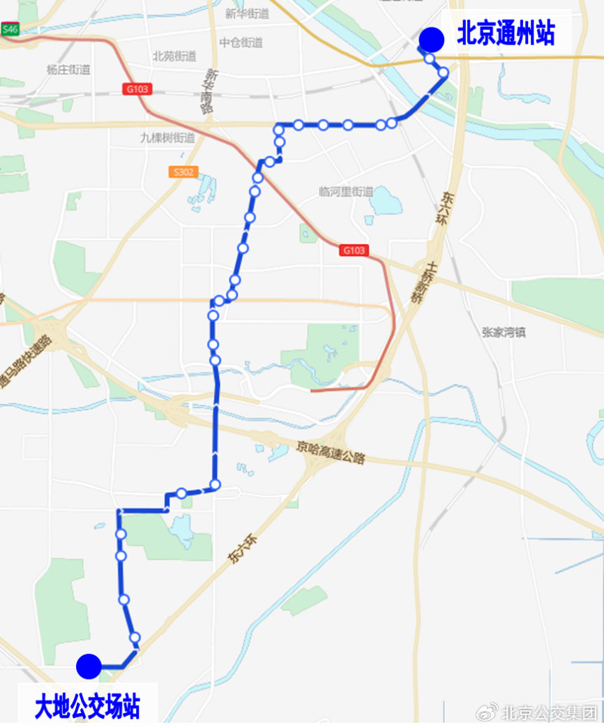 由北京通州站东发出,沿通运路、滨河中路至小圣庙桥东,沿通游专线1原路由至上码头路南站。