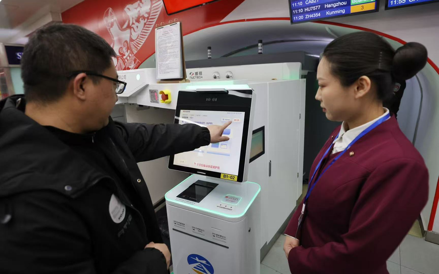 12月29日,北京地铁东直门站,一位旅客正在自助办理值机。新京报记者 王贵彬 摄