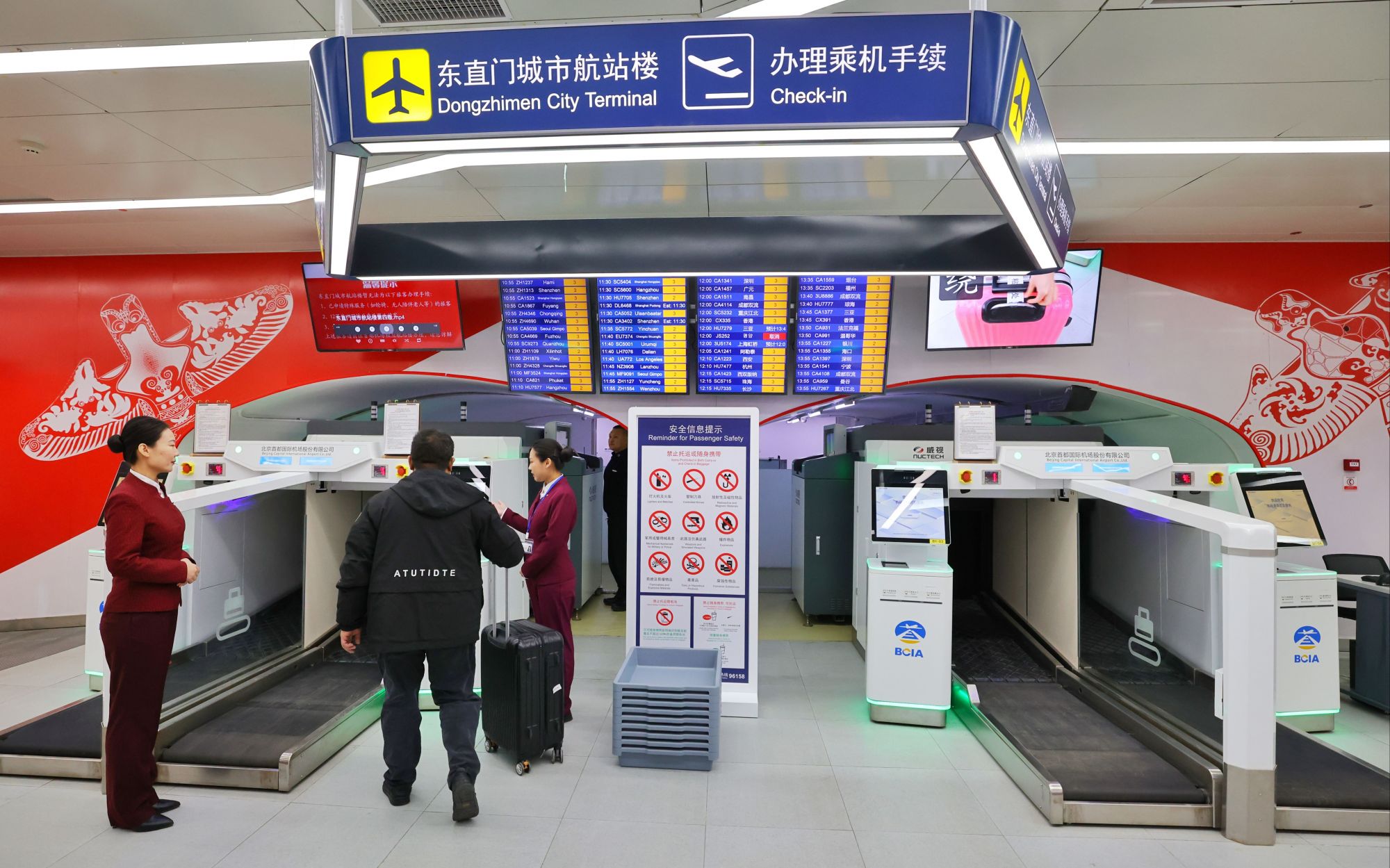 记者了解到,旅客在东直门站完成值机托运后,行李将通过机场线专用车厢直送首都机场T3航站楼,不仅节省了前往机场后的排队时间,也有效分散了航站楼值机柜台的压力。