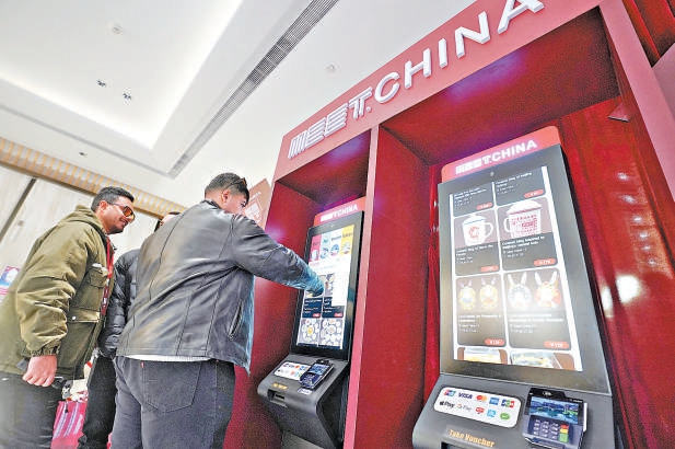 新安装的Meet China机器前,外籍青年正在购物。 本报记者 程功摄
