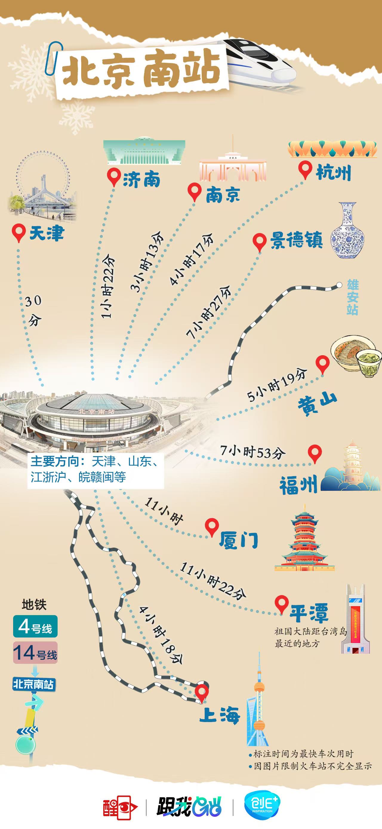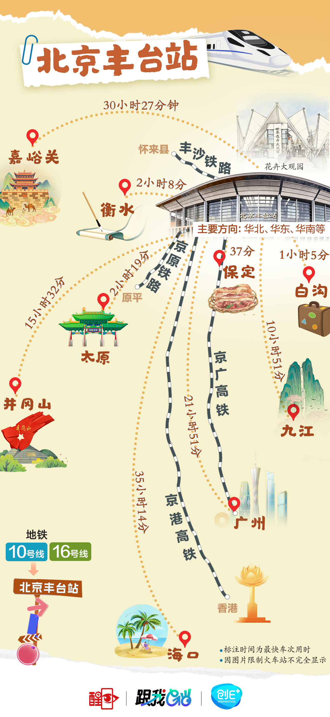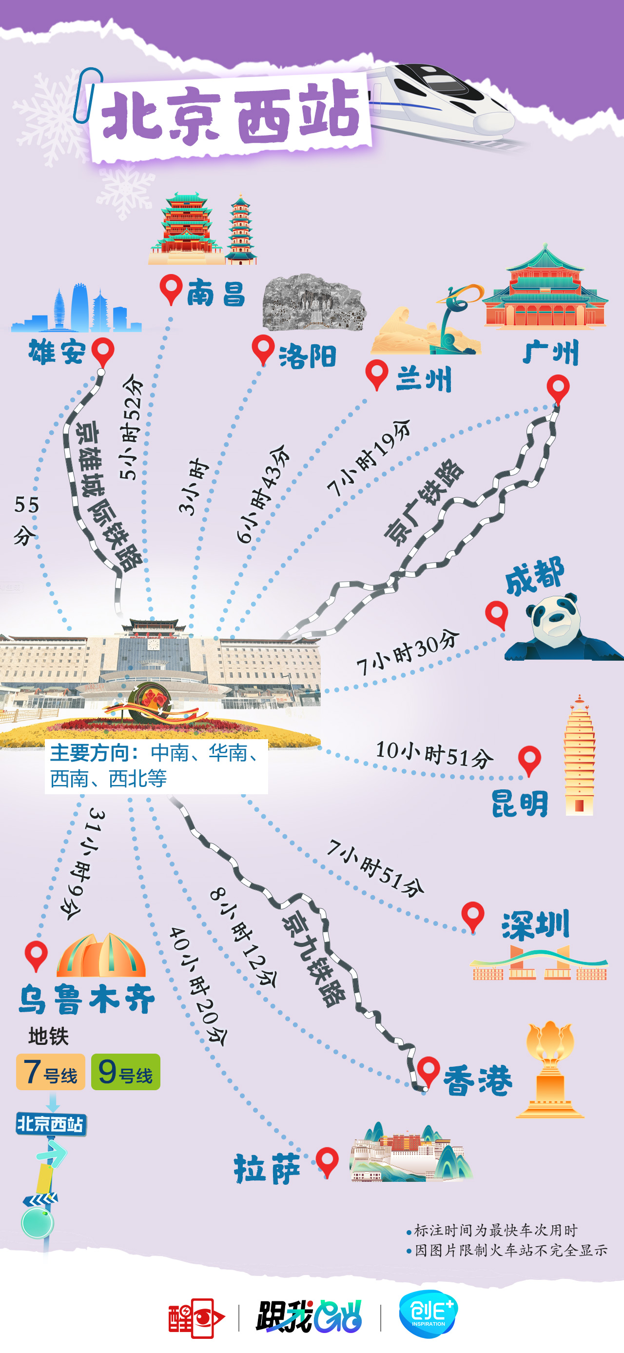 因图片限制各地火车站不完全显示;标注时间为最快车次用时。
