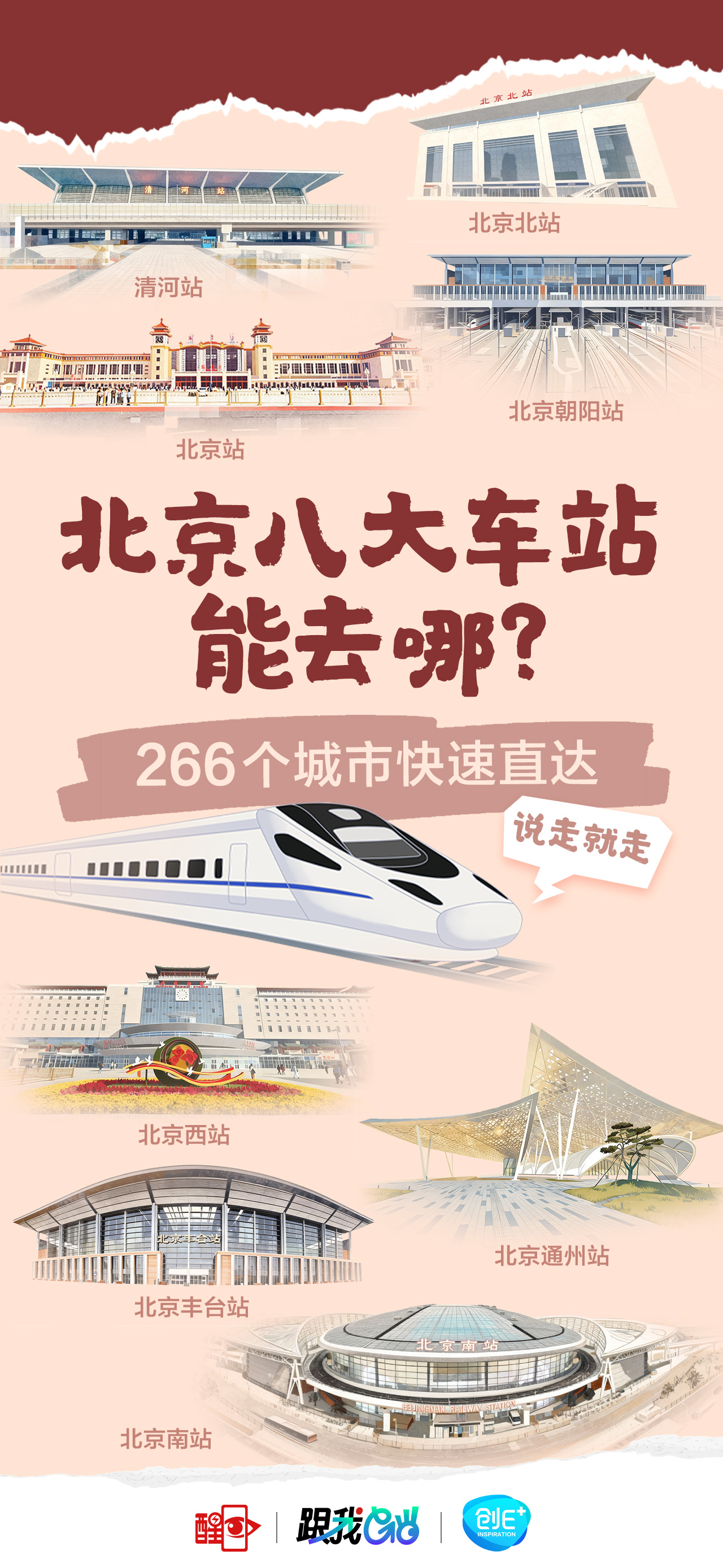 八站“各司其职”,按方向“分工”。例如,东向及东北向的铁路列车由北京站、北京朝阳站及北京通州站承担,西北向的铁路列车由北京北站、清河站承担,西南向的列车由北京西站、北京丰台站承担,东南向的列车由北京南站承担。如今,北京八大火车站出发,可以直达全国266个城市。
