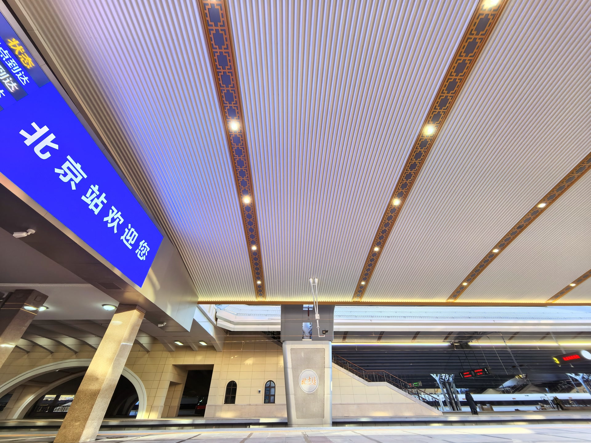 近日,从北京站上下车的旅客行至站台处抬头就能发现,头顶的雨棚不再是冰冷的工业建筑,不仅更加安全实用,“颜值”也大大提升——棚顶“琉璃黄”与“象牙白”的颜色组合,延续“中华第一站”的庄重典雅;连续景观灯带顺势铺展,亮起时如点点星光串联成线。雨棚还变得更“聪明”,其中藏着不少科技奥秘。
