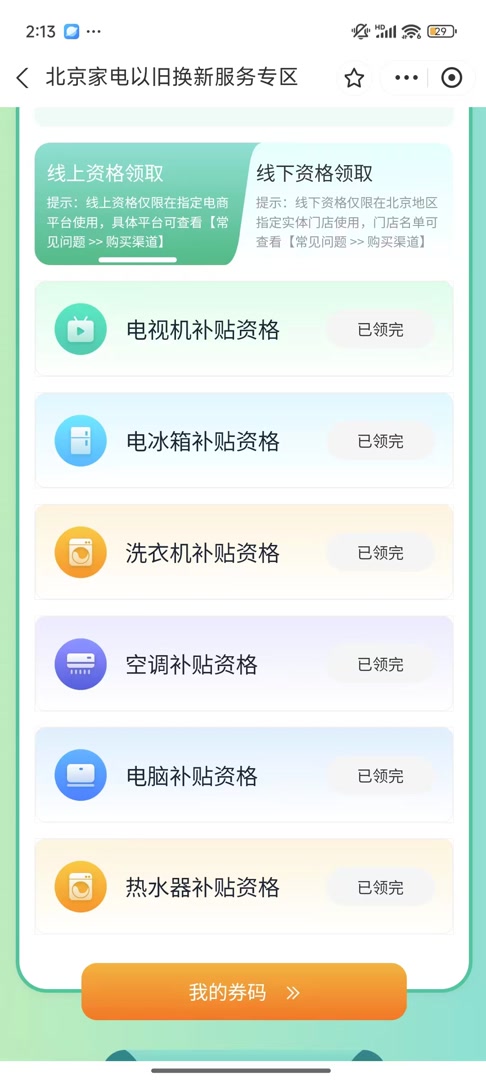 在国补资格领取的具体方式上,消费者通过京通小程序完成实名认证后,可进入“家电、数码以旧换新专区”领取线上或线下补贴资格,并前往政策参与企业的线上商城或线下门店购买政策补贴范围内商品。补贴资格每日上午8点开始发放。