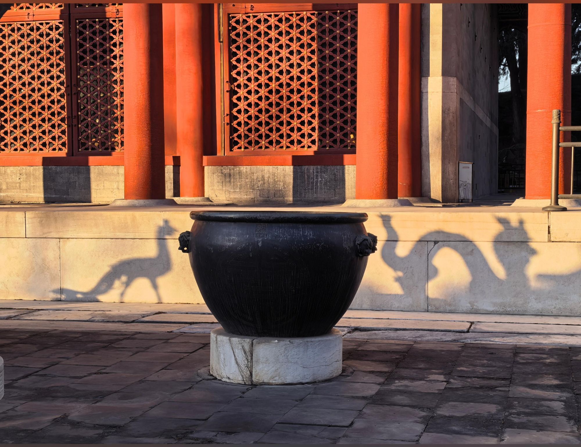 “由于太阳高度在不断变化,机位也得跟着微调,最好提前一天来踩点,确定大致位置,第二天一早再来拍摄,不然很容易错过最佳角度。”马涛说,斜对着铜龙的机位和斜对着铜缸的机位,都可以拍到龙凤同框的对称感。“拍摄时,三脚架的高度要略低于栏杆,这样可以让龙凤的影子显得高大挺拔,气场更足。”