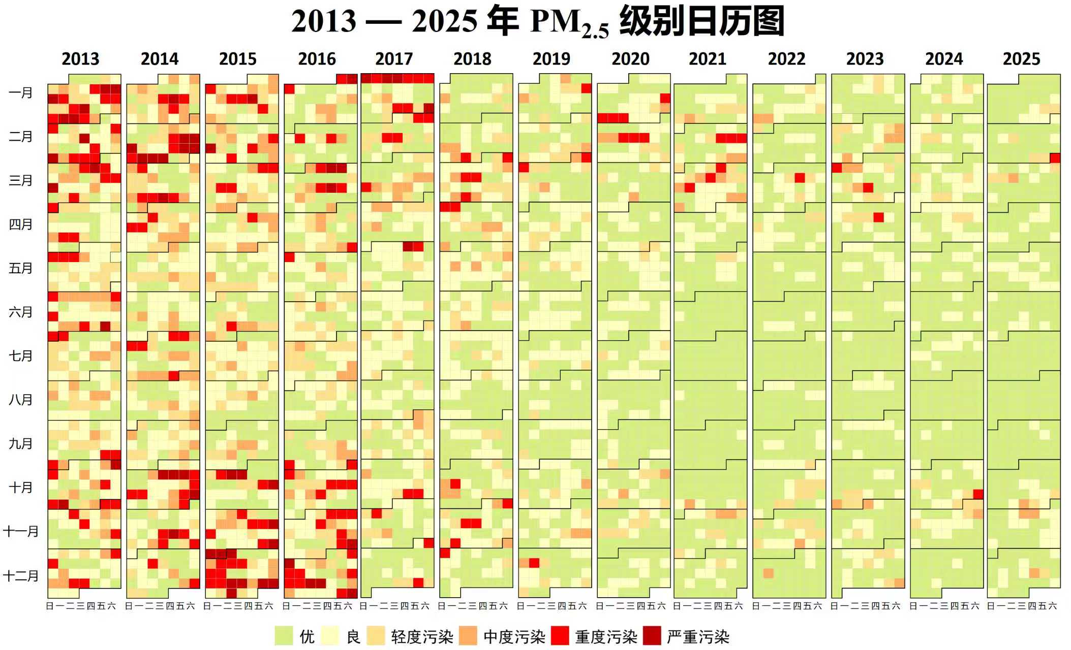 图说:2013-2025年北京市PM2.5浓度及累计变幅