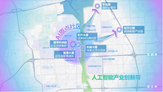 该街区以五道口3公里区域为核心,突出清华+北大+中科院+智源+奇绩创坛+N个创新企业的独一无二生态聚合效应,整合东升大厦、清华科技园、智源大厦等载体,打造百万平方米产业空间,形成“两核爆点+两支撑极”布局,同时辐射带动区域涵盖学北园、东升三期和京张遗址公园人工智能产业创新带。