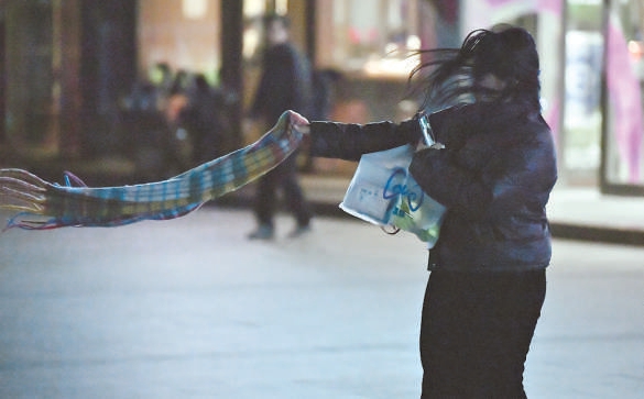 1月9日晚,在通州九棵树,行人在大风中行走。 北京日报记者 蔡代征摄