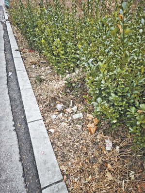 地铁石厂站B口附近的绿化带里,又被扔了不少垃圾。