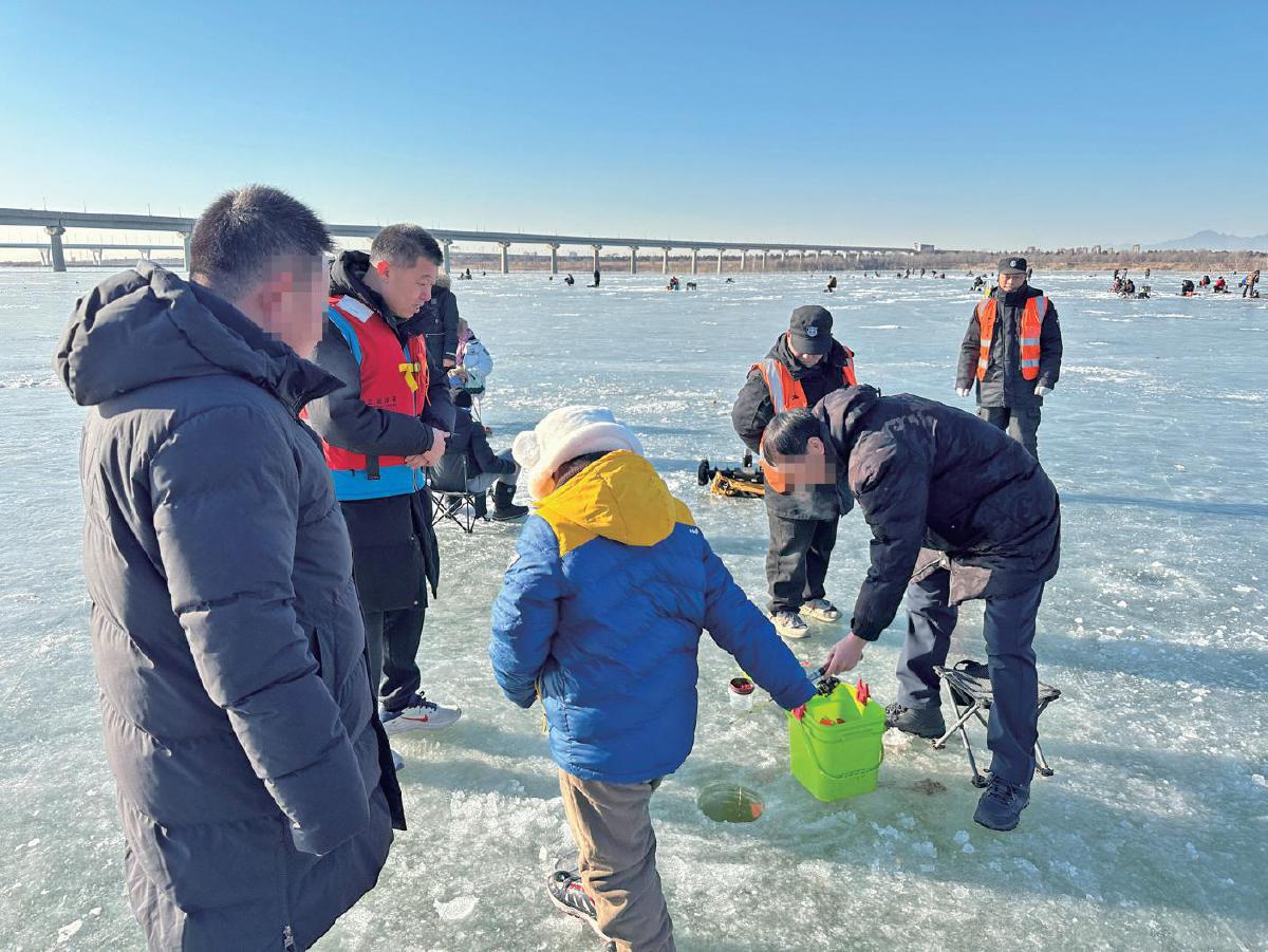 钓鱼爱好者也看上了这宽阔的冰面。他们用冰镩子在冰面上凿出圆洞,撒下鱼饵,放下鱼竿,静待鱼儿上钩。河面上,分布着不少冰钓的洞口,有的洞口经过一夜,又封上了冰层,有的则仍然“敞”着口,从洞口能够清晰地看到流动的河水。