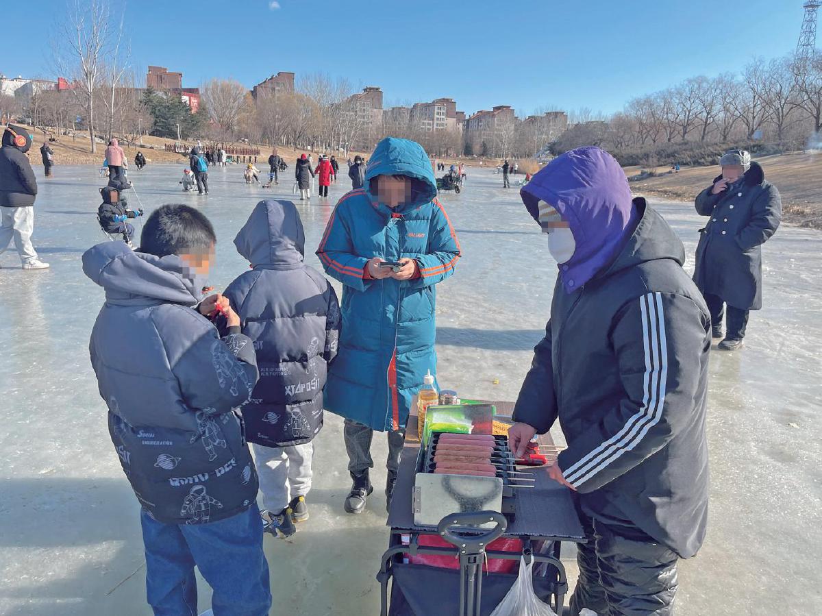 1月10日,长阳公园冰面,商贩售卖烤肠。 本版摄影/新京报记者 吴婷婷(除署名外)
