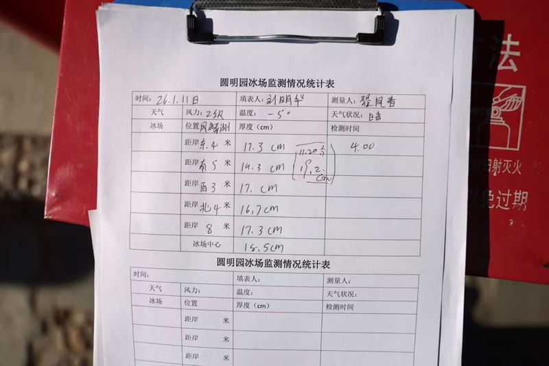 该点位冰层厚度19.2厘米(安全标准15厘米)。据悉,工作人员每日早中晚分三次,在冰场六个不同点位测量并记录冰层厚度,确保冰层厚度不低于15厘米。夜间还会对冰面裂缝进行浇水补冰处理。冰场内配备救援绳、救援梯、救生圈等应急物资,并有安全员全天候不间断巡视。