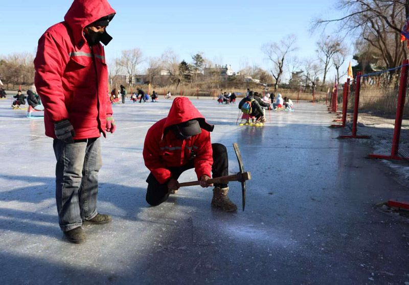 1月11日,圆明园凤麟洲冰场,工作人员凿冰洞准备测量冰层厚度。“三九”降临,北京各冰场逐步开放。记者探访全市最早开放的圆明园冰场,聚焦其安全管理措施。