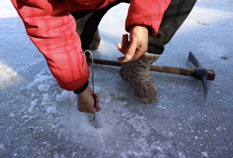 冰洞凿开后,工作人员用自制工具进行测量。
