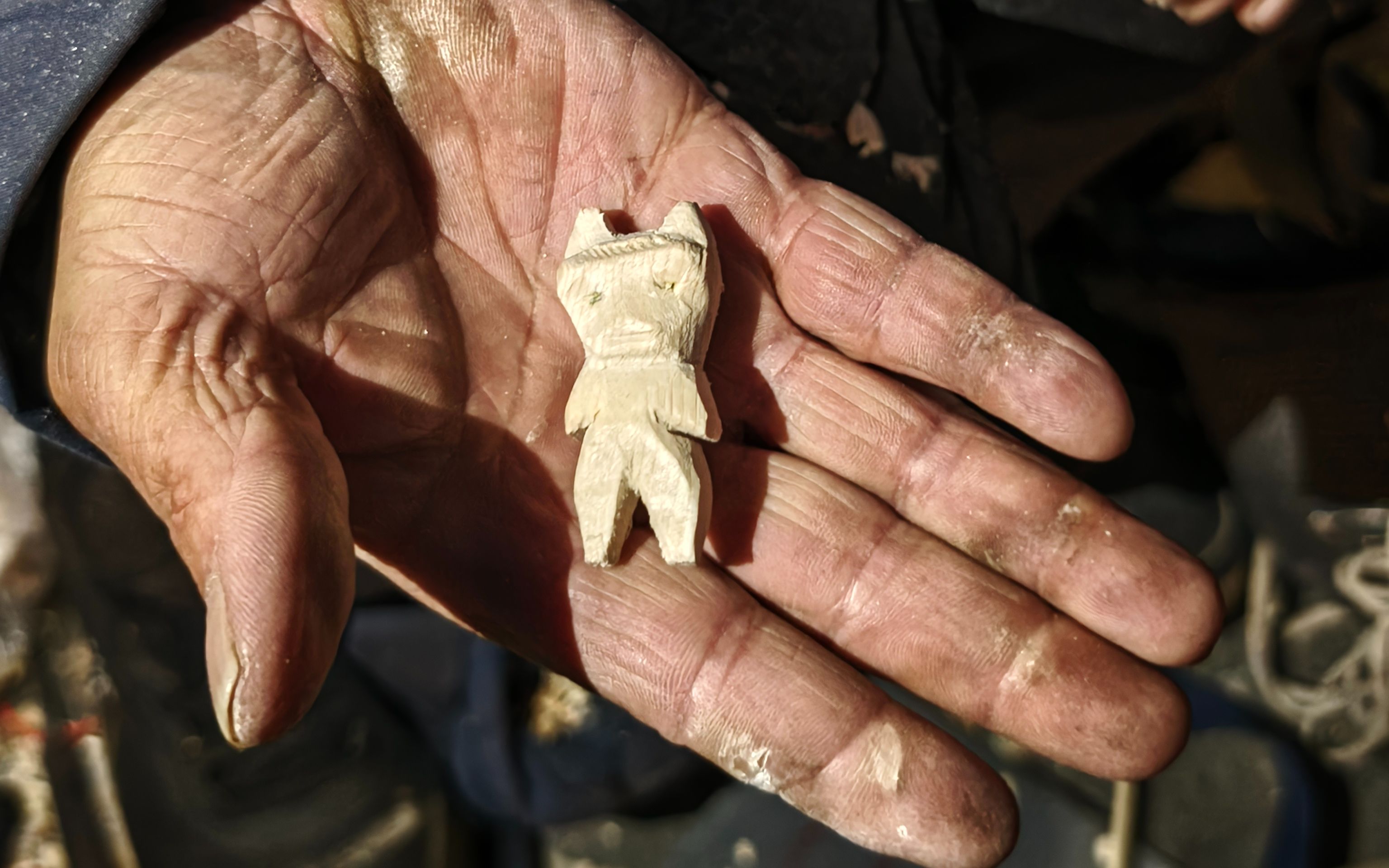 等了一上午的人们,最先挤进了包围圈,他们跟着老人一起,在最里面蹲成一圈,许多年轻的手汇聚在一起,在成堆的木雕里,寻找一个个在短视频里见到过的样式。