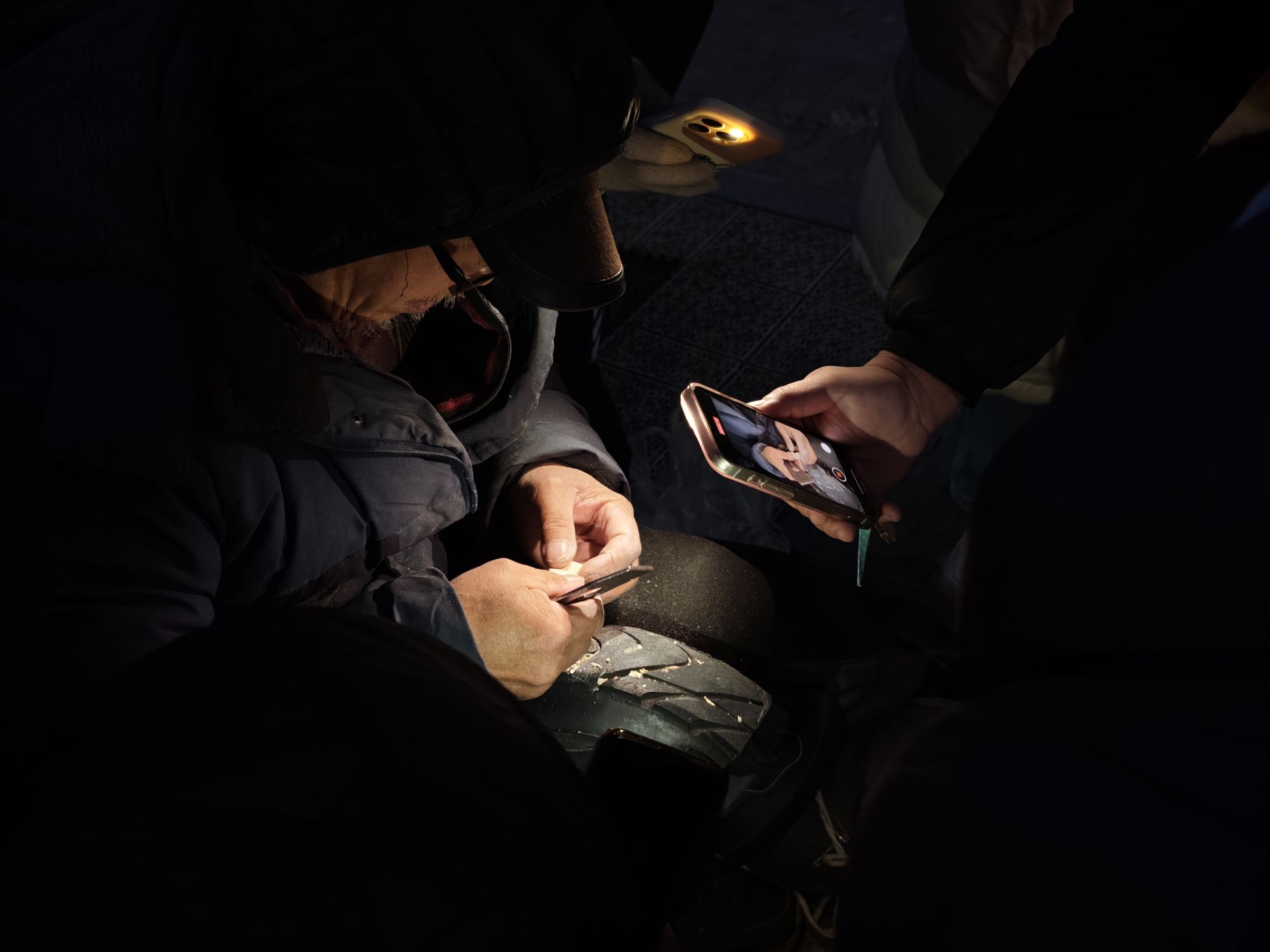 天色变暗,“木雕大爷”看不清木头,但购买者仍不肯离去,打开手机手电筒照明。新京报记者 王巍 摄