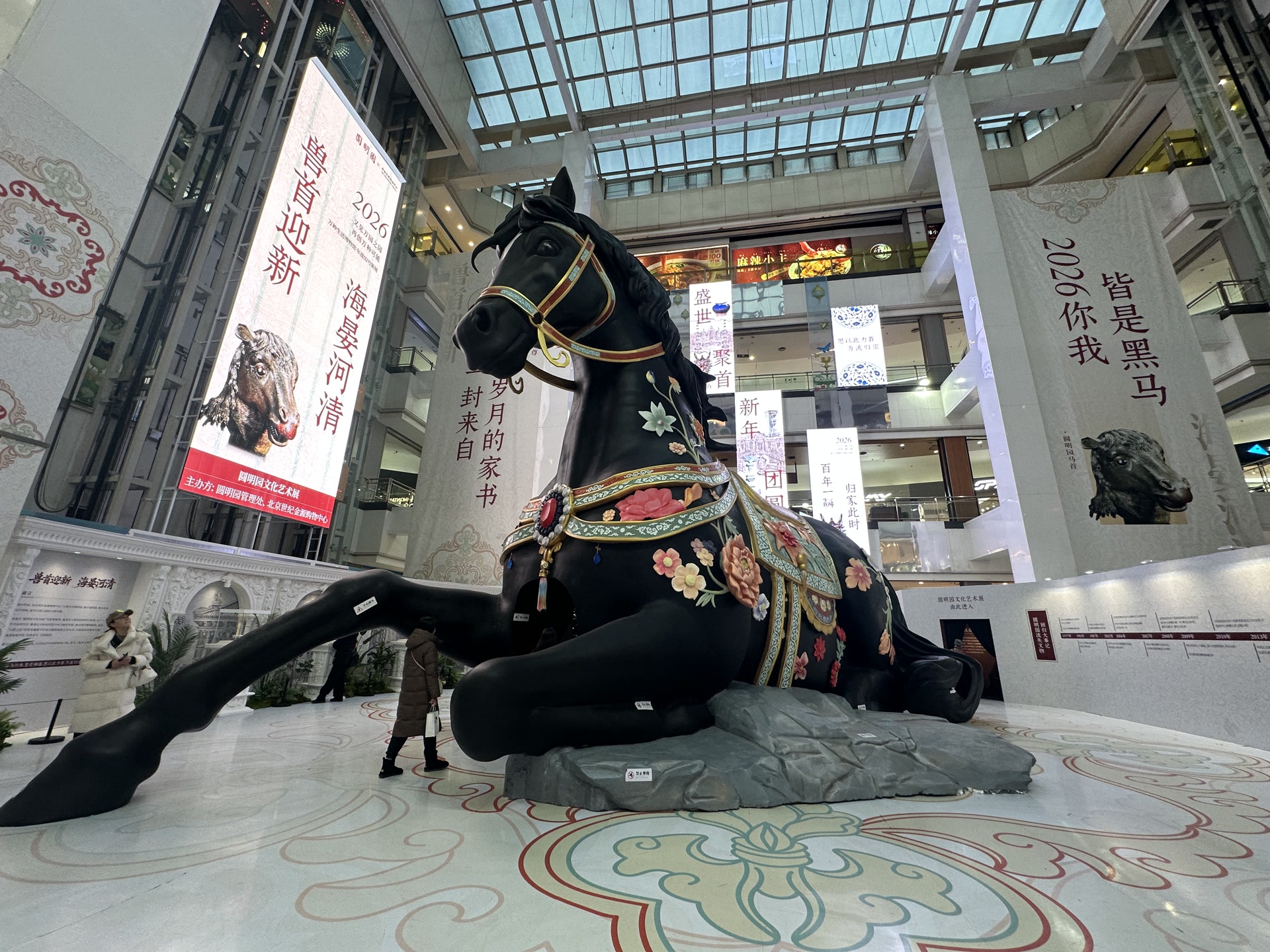 “哇!妈妈,这匹黑马真帅,快给我拍张照。”在世纪金源购物中心商场二层中庭,一尊16米长、3层楼高的黑色巨马艺术装置,瞬间抓住过往行人的目光,大家纷纷停下拍照打卡。这里正在举办“兽首迎新 海晏河清——圆明园文化艺术展”,这尊巨马以圆明园马首铜像为设计灵感,又融入清代宫廷画《乾隆大阅图》中的英武气韵,沉稳大气又不失灵动。