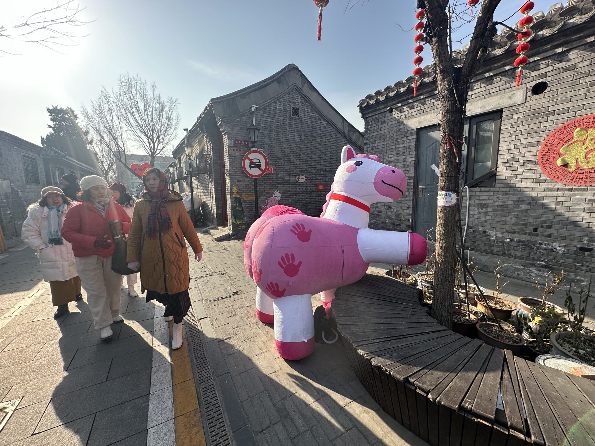 沿胡同往里走,七井胡同交叉口的粉白相间的卡通充气小马格外吸睛。它歪着脑袋、斜侧身子,萌态十足,成了整条胡同里最热门的打卡点。马屁股上印着的几个粉红手掌印,更是让人忍俊不禁。“‘拍拍马屁’,新的一年快马加鞭!”大二学生晓晓跟朋友笑着打趣,边说边拍下搞怪合影。胡同沿路的树上,挂满含“马”字的祝福语挂饰,一棵裹着毛衣的大树上,还挂着一圈五彩小马毛绒挂件。旁边的文创小店里,“马”主题的盲盒、包挂等文创产品摆在最显眼的位置,吸引市民驻足挑选。