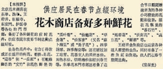 随着种植规模的扩大,北京在东单、西单、王府井、隆福寺等多地陆续开设了20多个鲜花商店,供应市场的花木从几十种增至上千种。那个时候,采购鲜花的主要是各大公共场所、外国使馆等。1959年春节前夕,黄土岗公社供应首都市场1.2万盆鲜花和可做花束、插瓶用的花签。其中,鲜花多是小盆栽植,适合室内摆放,价格也比往年便宜,如海棠从往年的每盆两角五分降至两角,引得不少市民前去购买。(1959年1月27日《北京晚报》4版,《黄土岗公社供应大量鲜花》)1961年春节前,漳州水仙、绍兴春兰等应季花卉进入北京,东单花木门市部还准备了适合赠送亲友的各种花篮和盆景,受到市民欢迎。(1961年2月8日《北京晚报》2版,《花木商店备好多种鲜花》)