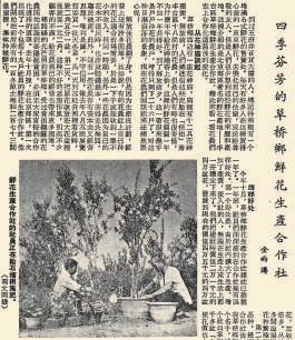 新中国成立后,花卉生产焕发出勃勃生机。1954年,草桥乡14户花农自动组织起来,成立了全国第一个鲜花生产合作社,并新建起273间温室,栽种了200多种约3万盆鲜花。(1955年3月7日《北京日报》2版,《四季如春的鲜花生产合作社》)