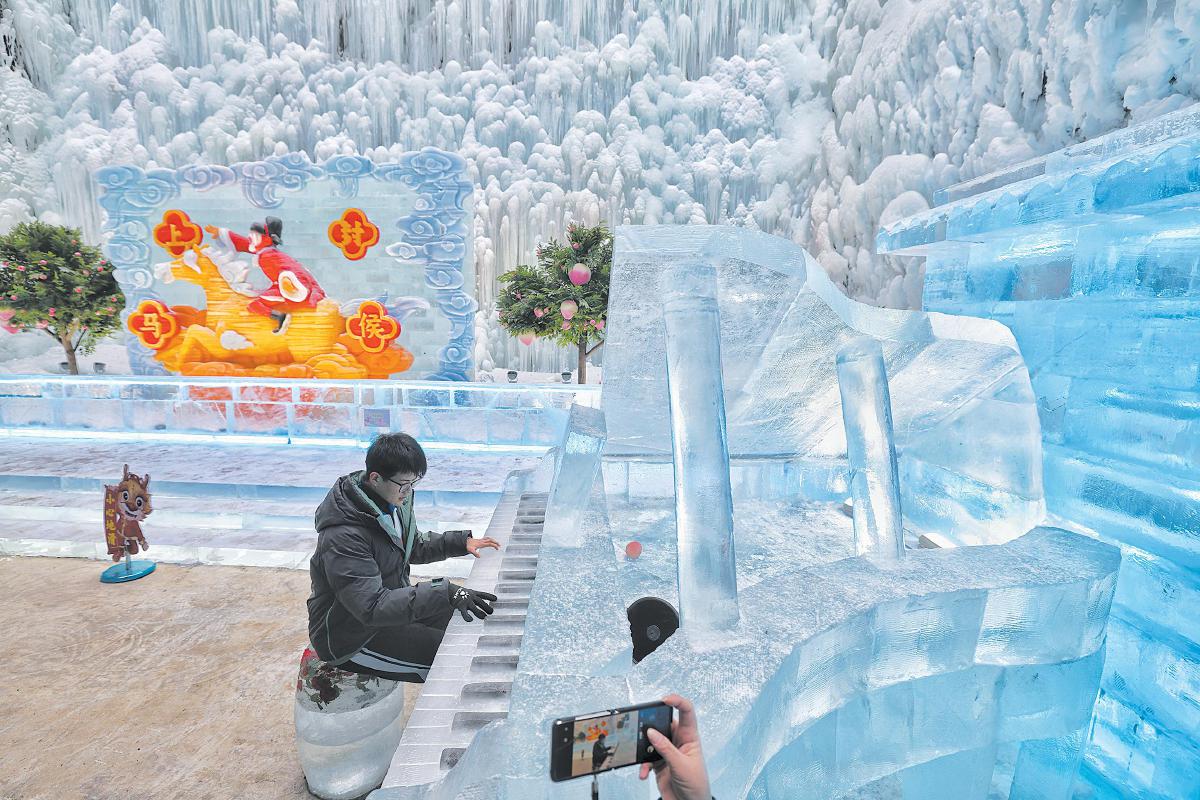 1月15日,龙庆峡,游客在制作的冰钢琴前打卡拍照。当日,第40届龙庆峡冰灯艺术节在北京延庆正式开幕。本届艺术节以“龙庆传奇·致敬经典”为主题,深情回望四十年冰雪文旅发展历程,更以国产动画经典《大闹天宫》IP为灵感打造奇幻冰境,搭配震撼山体激光秀等特色内容,为市民游客献上一场沉浸式冬日文旅盛宴。冰灯艺术节将持续至3月初。 新京报记者 陶冉 摄影报道
