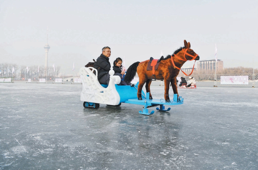 冰场位于公园东湖南岸,以东湖南码头为界划分为东、西两区,1400辆各式冰上娱乐设施可满足不同年龄段游客的需求。其中,西区主打经典冰上项目,既有传统的冰车与冰上自行车,也有让孩子们欢呼雀跃的“雷霆战车”;东区除了传统冰车外,还增添了卡通电动冰车、憨态可掬的狗拉雪橇冰车,以及特意为马年推出的马拉冰车等项目,更适合亲子互动与趣味体验。两个冰场采取分区售票、独立运营模式,门票仅限指定冰场使用。