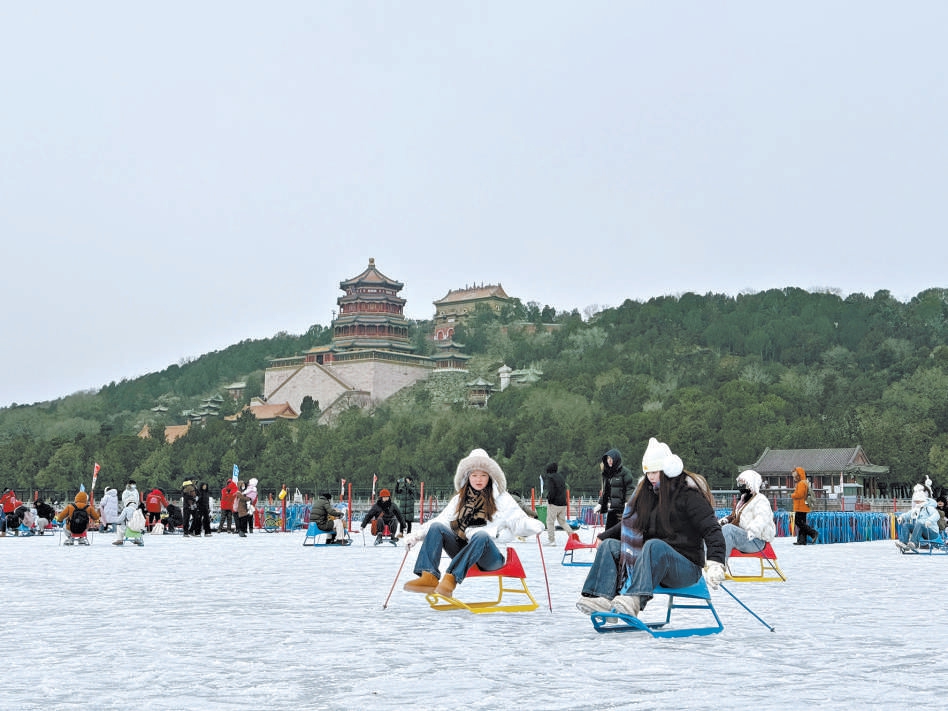 1月17日,颐和园昆明湖冰场向市民开放,色彩明快的冰车与冰上自行车在冰面上往来穿梭,为静谧的古典园林增添了生机盎然的冬日活力。本报记者 吴镝摄