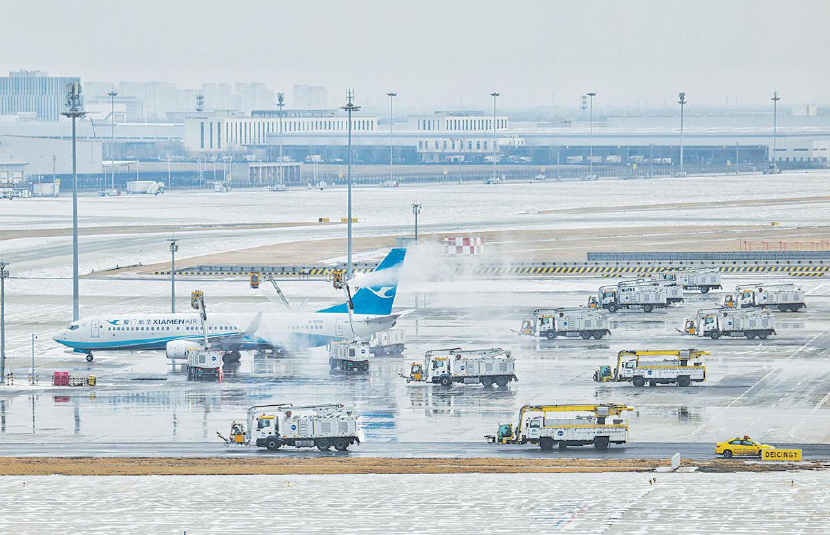 1月18日,北京大兴国际机场,飞机在出港前进行四车除冰作业。 新京报记者 陶冉 摄