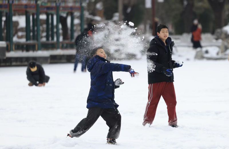 孩子呼朋引伴,兴奋地打雪仗。