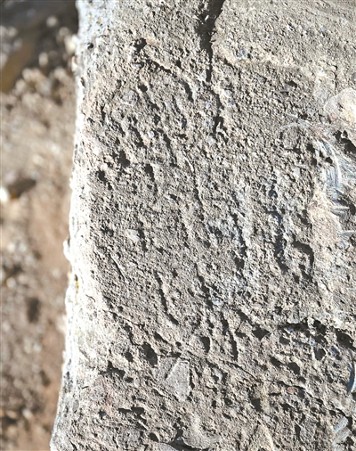 就在王旾探访刻石的同一日,记者跟随北京史地民俗学会会员赵海廷等文史爱好者,亦登上此刻石所在的山脊。所见刻石为寻常山岩,形貌朴拙,并无突出特征。其字面朝上,长约25厘米、宽约11厘米。因年久风化,镌刻痕迹已显模糊,字迹漫漶,可隐约辨认出自西向东纵刻三字,但若不细加审视极易忽略。