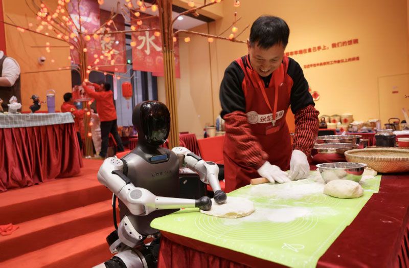机器人帮着衢江烤饼制作技艺传承人揉面。
