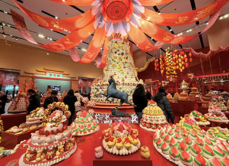 1月19日,中国非遗馆,嘉宾参观陕西省非遗代表性项目澄城面花作品《大鼓枣山》。《大鼓枣山》通高4.5米、直径3.6米,由18人团队历时1 个月制成,以非遗花馍之匠心,敬祖国山河之壮丽,祈中华民族之团圆。据悉,中国非物质文化遗产馆将于1月20日举办“过年——丙午春节系列主题展”。展览从春节承载的中华民族传统历法、生肖文化、粮食观和灯彩民俗等主题入手,串联起来自31个省(市、自治区)、新疆生产建设兵团和港澳台地区的百余项非物质文化遗产代表性项目,呈现多层次立体化的过年场景。