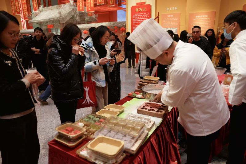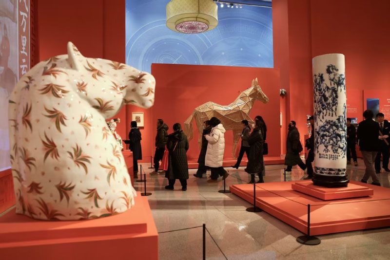 系列展览由四部分组成,“历序时新”展示中国传统历法的沿革、阴阳合历的形成、春节的确定及历史流变等内容。“骥跃鸿途”通过剪纸、年画、皮影、陶瓷、石雕、皮雕、竹编、泥塑等多种传统技艺类非遗作品的展示,让观众领略马的俊朗神姿及其美好的文化意蕴。“食为天”以“五谷为本”“食以养人”等中国人的粮食观为线索,集中展示各地非遗美食。“光转春辉”选取近百件节日主题非遗灯彩作品,营造万家欢乐的节日氛围空间。