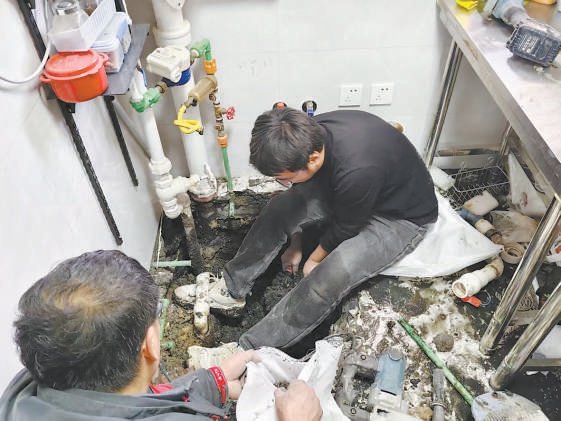 段迪多次与产权单位、物业沟通,协调维修事宜。考虑到维修需刨开一层住户厨房地面,且涉及整楼临时停水,社区党委迅速启动应急响应机制。1月8日,维修作业正式启动。因老楼厨房空间狭小,每次只能容纳一人在开挖处操作,施工难度比预想中更大。为了尽可能缩短工期,减少对居民生活的影响,维修人员一口气从8点干到20点,连中午都顾不上休息。在此期间,社工两人一组,轮班到现场值守。他们为居民答疑解惑,还为有需要的居民送去桶装饮用水。