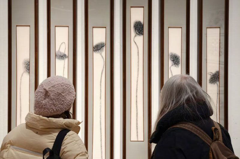 观众参观苏绣条屏。苏绣发源于苏州镇湖,过去“家家刺绣”。早期用于服饰,新中国成立后肖像作品成为国礼。改革开放后,绣娘吸收多元技艺,20世纪80年代收入已远超农耕,形成产业集群。如今,年产值近15亿元。