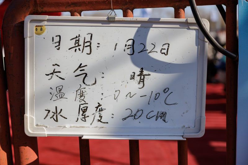 消防员向围观市民和景区工作人员讲解了冰面救援服、PFD救生衣、冰锥、漂浮担架、香蕉救援船、探杆等装备的用途。