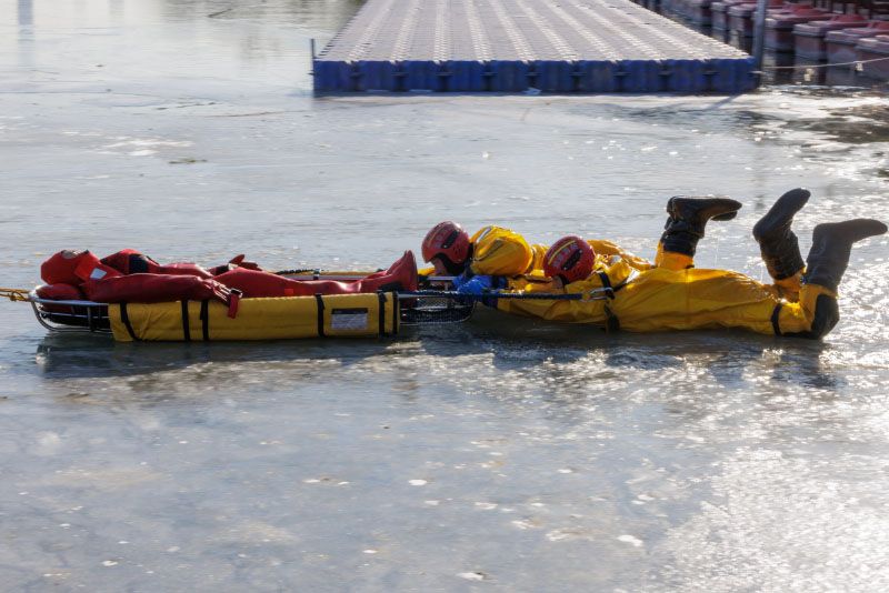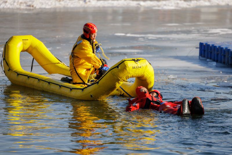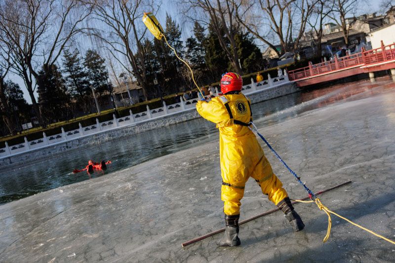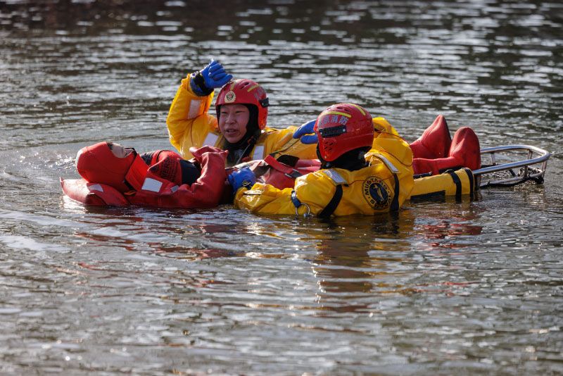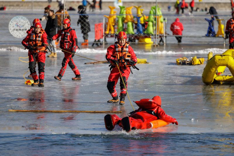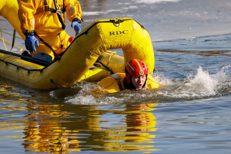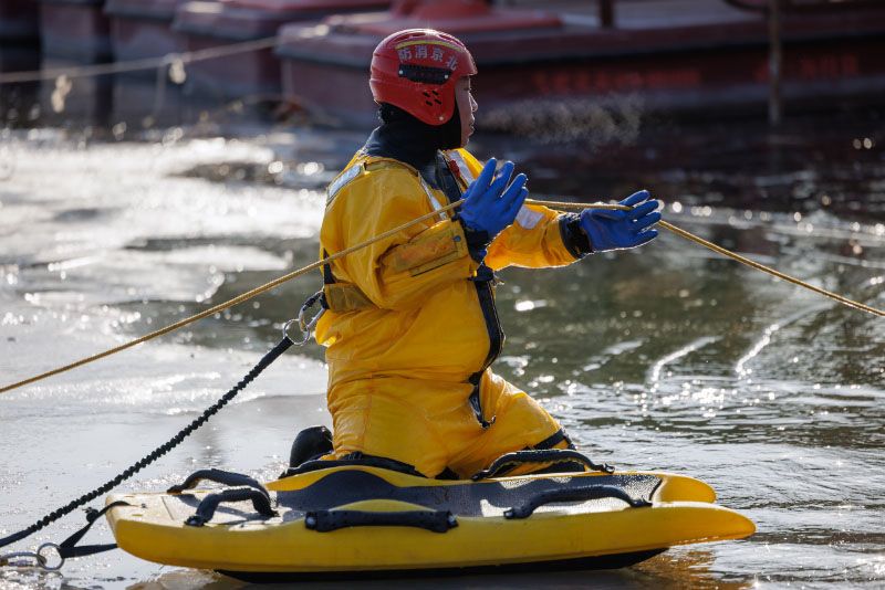 随着指挥员一声令下,围绕“游客不慎坠冰”这一警情设定的演练迅速展开。图为消防员将香蕉救生船与漂浮绳连接。