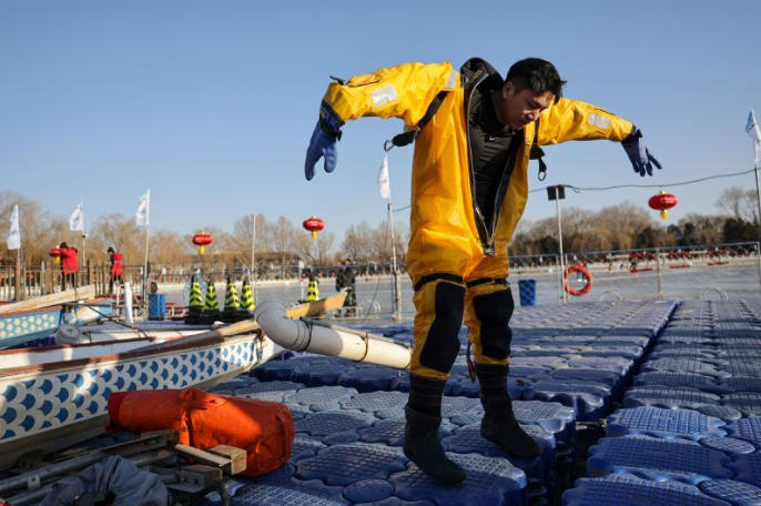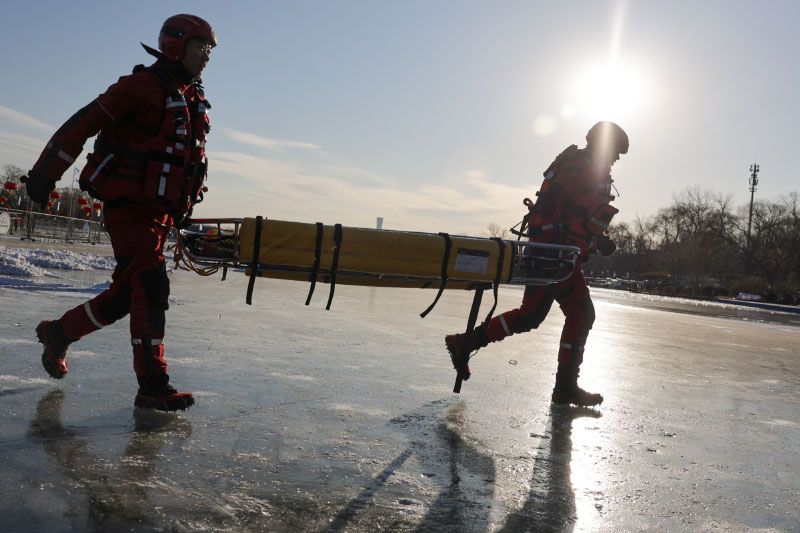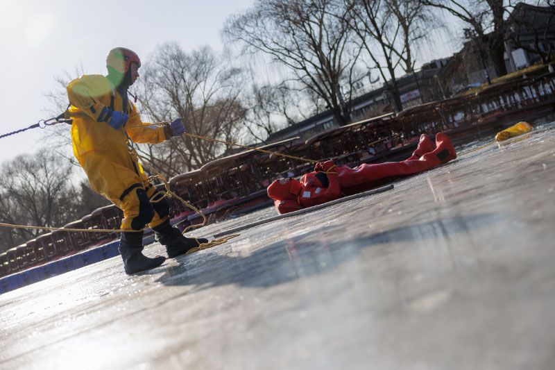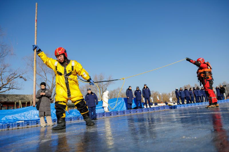1月22日,西城区消防救援支队在什刹海后海水上运动中心湖面冰域,开展冰域救援综合演练,旨在全面提升冬季冰域应急救援实战能力,强化队伍应对冰上突发事件的处置水平,同时面向公众普及冬季冰上活动安全知识。图为演练前,消防员利用探杆确认冰面情况。
