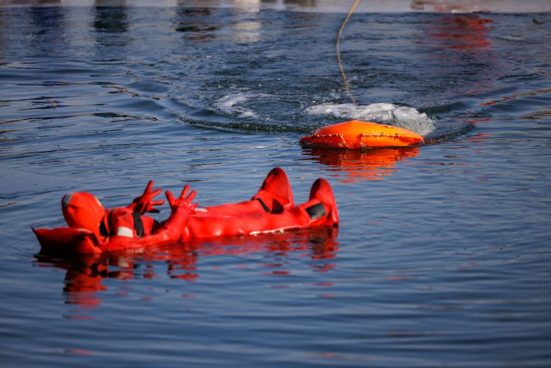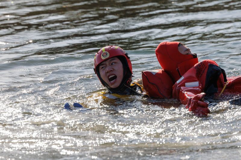 消防员抛出绳索,让“落水者”抓握自救攀爬上岸。