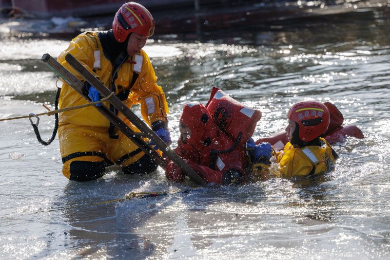 在直接救援环节,队员身着全套冰域救援防护服,接近“落水者”,为他套上救援吊带,很快将“落水者”从冰窟中救出。